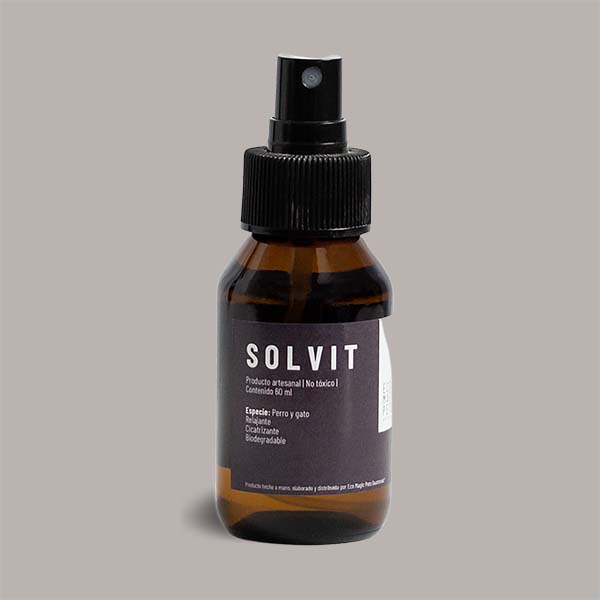 Dosis: aplica varias gotas de Solvit y realiza masajes a tu mascota detrás de las orejas, abdomen y espalda. Producto artesanal No tóxico Contiene 60ml